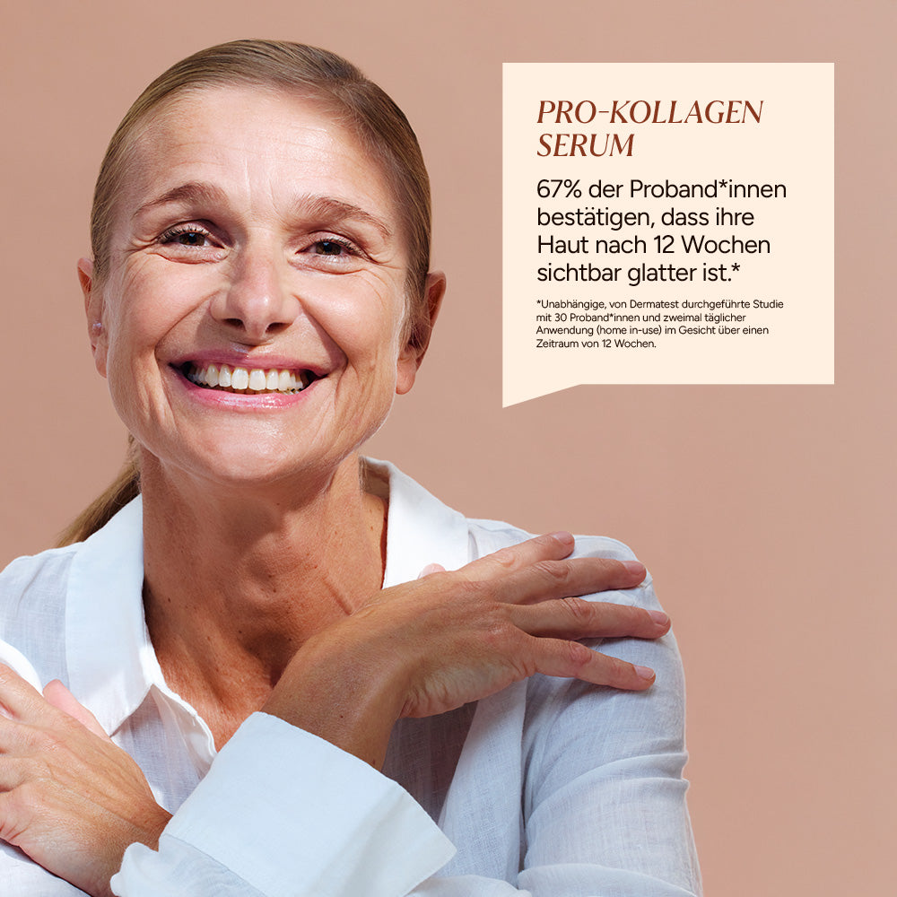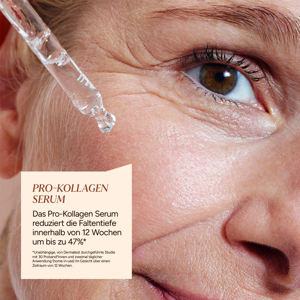 Kollagen funktioniert wie ein Gerüst, das die Haut stabil, elastisch und widerstandsfähig hält. Zusammen mit Elastin und Hyaluron bildet es die Grundlage für die Festigkeit und Spannkraft der Haut. Mit der Zeit produziert der Körper aber immer weniger Kollagen selbst, wodurch die Haut an Festigkeit verliert und weniger Feuchtigkeit halten kann. Mit bestimmten Wirkstoffen kann man die Kollagensynthese ganz natürlich unterstützen und so die Haut stabil und gesund halten. Unser Pro-Kollagen Serum regt die Kollagensynthese gezielt an und stärkt so das Gerüst – für eine strafferes und glatteres Hautbild.